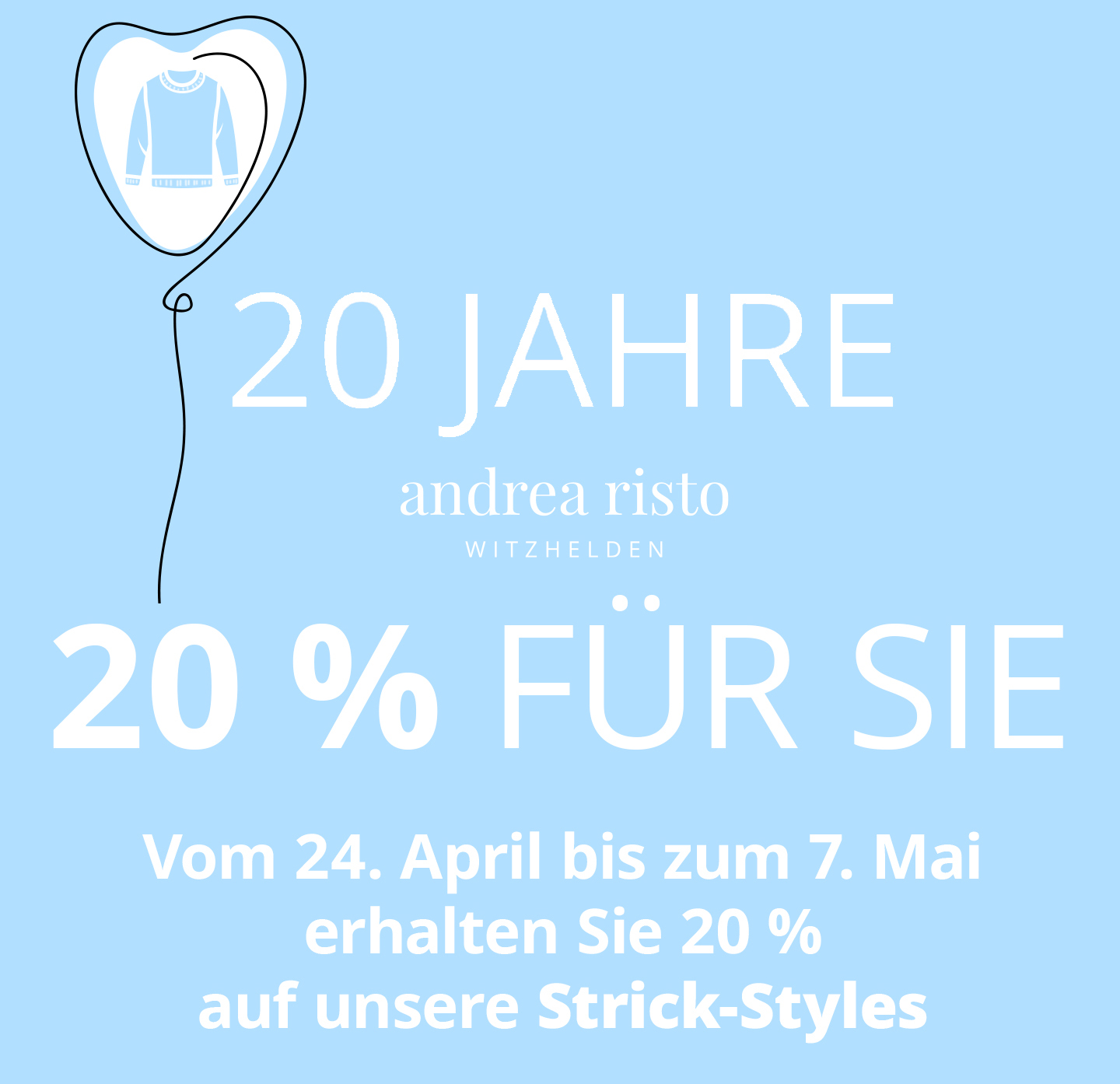 Freuen Sie sich ab morgen (24.04.) bis zum übernächsten Donnerstag (07.05.) auf 20 % auf fast alle Modelle.